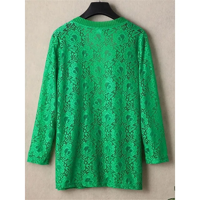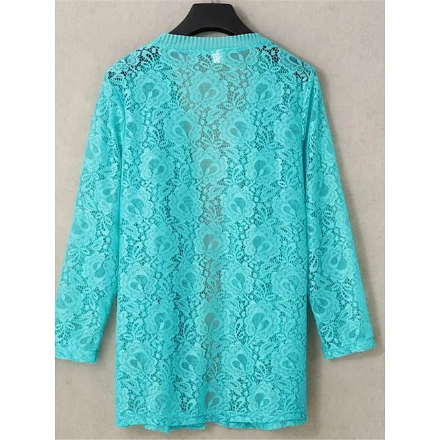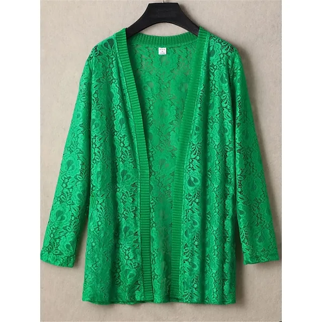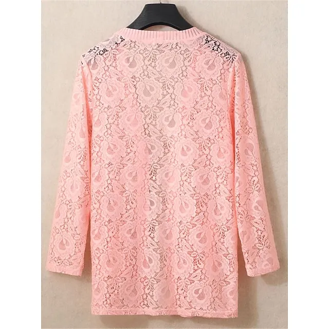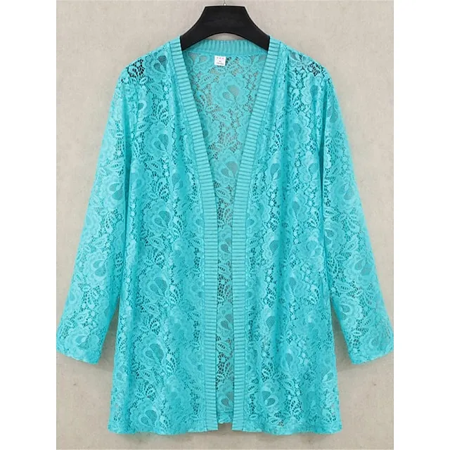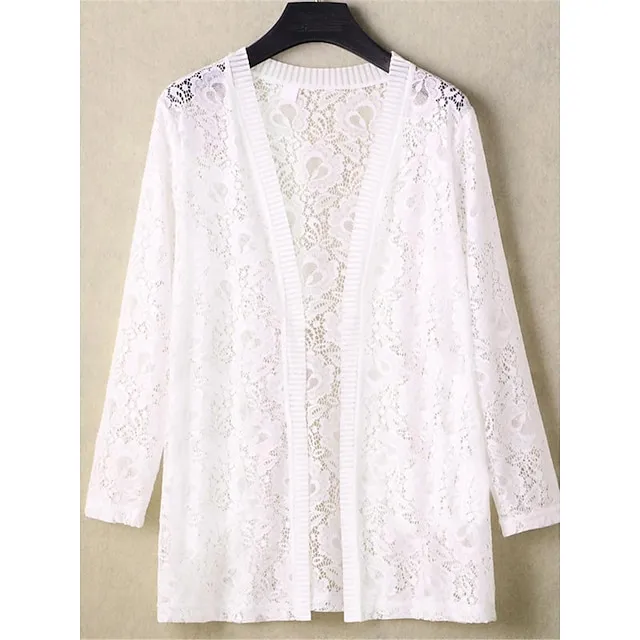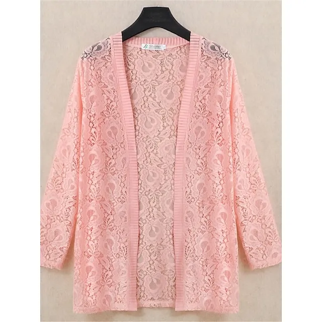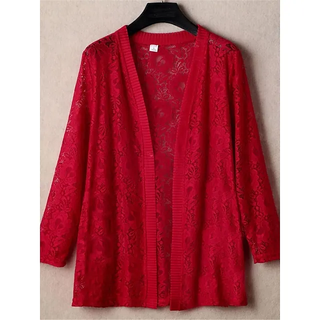 Women’s Cardigan Sweater Open Front Crochet Knit Cotton Lace Trims Summer Spring Tunic Daily Going out Weekend Stylish Casual Soft 3/4 Length Sleeve Solid Color White Pink Red XL 2XL 3XL