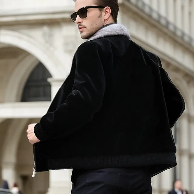 Men’s Winter Jacket Faux Fur Outdoor Daily Wear Warm Pocket with White Trim Winter Plain Fashion Streetwear Lapel Regular Black Jacket