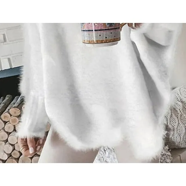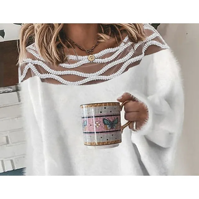 Women’s Pullover Sweater Jumper Crew Neck Crochet Fuzzy Knit Imitation Mink Lace Trims Fall Winter Cropped Daily Going out Stylish Long Sleeve Solid Color White S M L