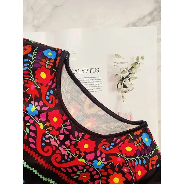 Women’s T shirt Tee Floral Boho Ethnic Casual Festival claret Black Floral Long Sleeve Vintage Basic Boho Round Neck Spring & Fall Fall & Winter