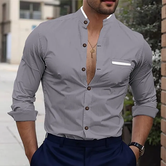 Men’s Shirt Dress Shirt Button Up Shirt White Dark Blue Light Sky Blue Long Sleeve Color Block Standing Collar Spring & Fall Office & Career Wedding Party Clothing Apparel Pocket